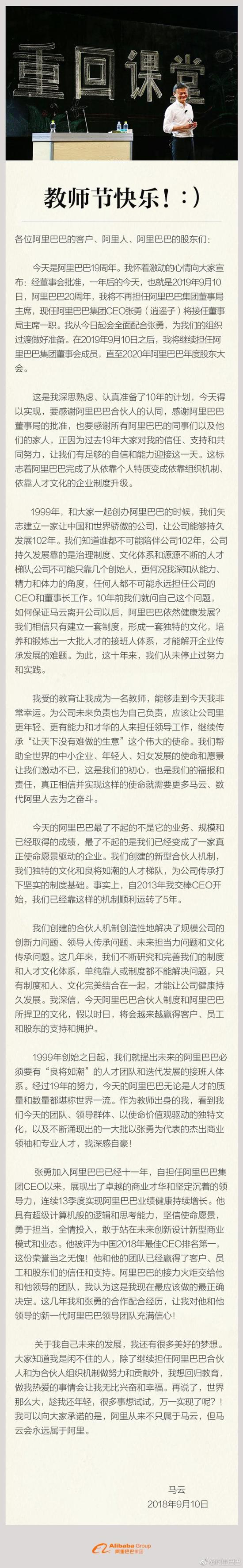 馬云明年今日將卸任阿里董事局主席 CEO張勇接任