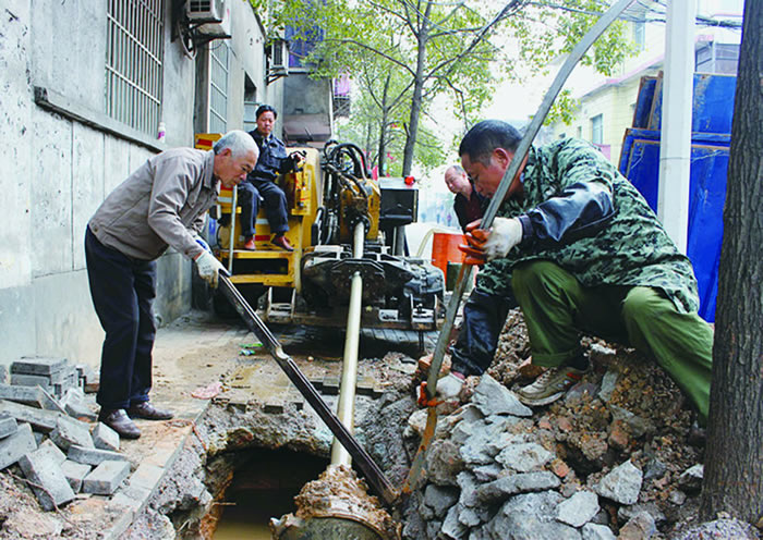 工人們正在施工現(xiàn)場(chǎng)進(jìn)行頂管作業(yè)(鐘江波 攝)