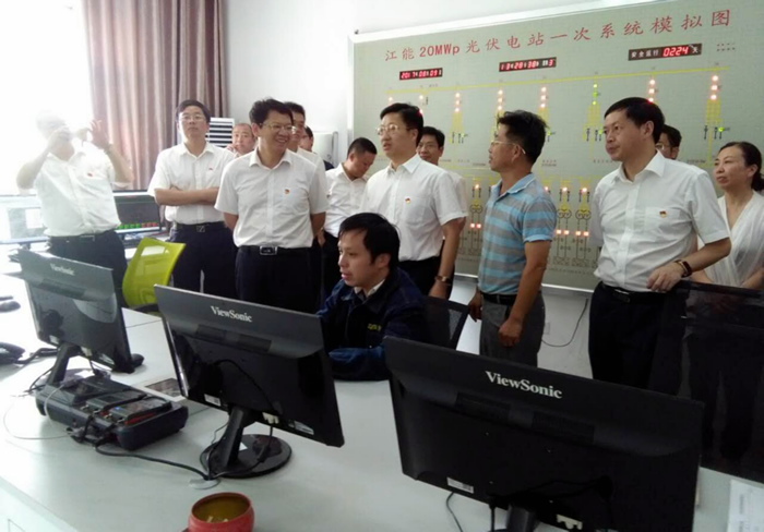 圖為黃萬林一行在江能光伏電業(yè)公司總控制室。