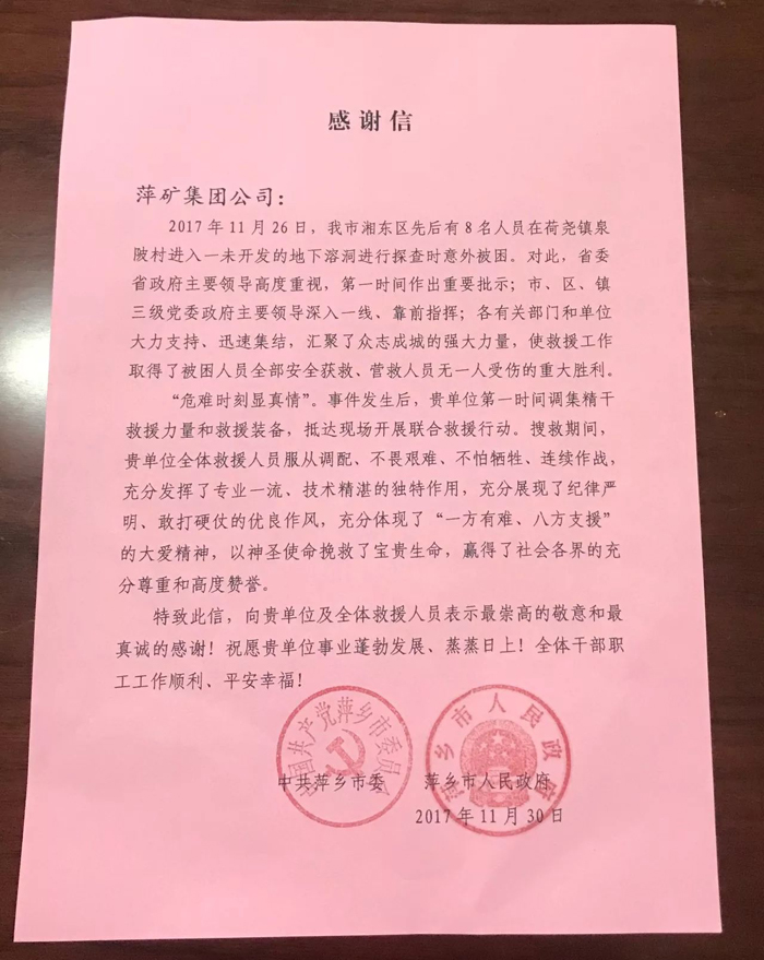 12月1日上午,萍礦集團公司接到了一封萍鄉(xiāng)市委市政府送來的感謝信,對公司積極派人參與成功救援湘東荷堯地下溶洞人員被困行動表示感謝。 26日上午10時30分許,有8人先后進入湘東區(qū)荷堯鎮(zhèn)一未開發(fā)溶洞進行探查時被困,牽動了各級政府和百姓的心。經(jīng)過各方大力救援,27日成功救出3人,另有5名被困人員未找到。生命至上,人命關天。27日傍晚18時30分,萍礦集團接到上級要求派員參與救援行動的通知后,公司黨政領導高度重視,第一時間作出部署,抽調(diào)人員組織精干團隊,由副總經(jīng)理、總工程師彭群倫帶隊,生產(chǎn)技術部副部長鄒云福、安源煤礦機電副總工程師鄒林和制修廠副廠長張其組成應急救援小組,帶上相應設備,立即趕赴人員被困現(xiàn)場。隨后,又派出了湘雅萍礦合作醫(yī)院應急救援隊成員孫亞斌、肖饒軍、江麗和倪堅組成的救援小組立即趕赴現(xiàn)場。 救援現(xiàn)場,應急救援小組成員憑借多年的工作經(jīng)驗和專業(yè)優(yōu)勢,積極參與救援。為更好地掌握情況,為指揮部制定科學的救援方案提供依據(jù),彭群倫和鄒云福等人進入溶洞勘察地形。洞內(nèi)隧道寬窄不一,寬敞處多有暗河流經(jīng)或需涉水而過,積水齊人腰深,不一會兒,幾個人全身都濕透了。狹窄處只容一人匍匐前行,堅硬的巖石刺得手臂生痛,但大伙都沒有退卻。仔細觀察了地形地貌,了解情況后,彭群倫及時向指揮部進行匯報,并提出了救援建議。湘雅萍礦合作醫(yī)院應急救援小組也一直堅守在現(xiàn)場,就地講授救援知識,對因連續(xù)作戰(zhàn)出現(xiàn)虛脫的消防救援人員進行醫(yī)療救援。 11月29日凌晨4時許,經(jīng)過科學救援,溶洞中最后5名被困人員被成功救出,且均身體狀況良好。直到這時,堅守現(xiàn)場的救援人員才長長地舒了一口氣。整個救援過程中,萍礦集團公司領導密切關注現(xiàn)場救援情況,與應急救援小組成員保持緊密聯(lián)系,從人力物力上給予支持。參與現(xiàn)場救援的人員紀律嚴明、服從調(diào)配、艱苦奮戰(zhàn),充分體現(xiàn)了國有企業(yè)的擔當精神,和“一方有難、八方支援”的大愛精神,共同演繹了一場溫馨的小城大愛。(謝紅英 攝)