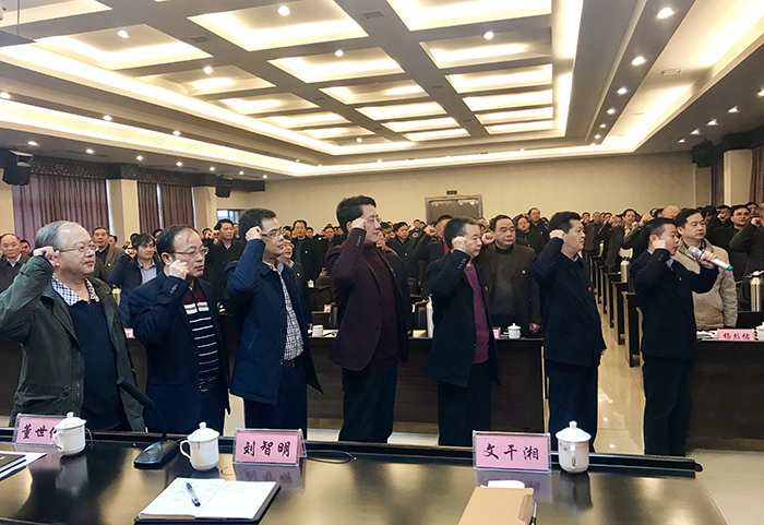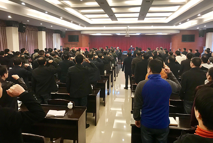 圖為全公司中層副職以上黨員領(lǐng)導(dǎo)干部正在集體重溫入黨誓詞。謝紅英 攝