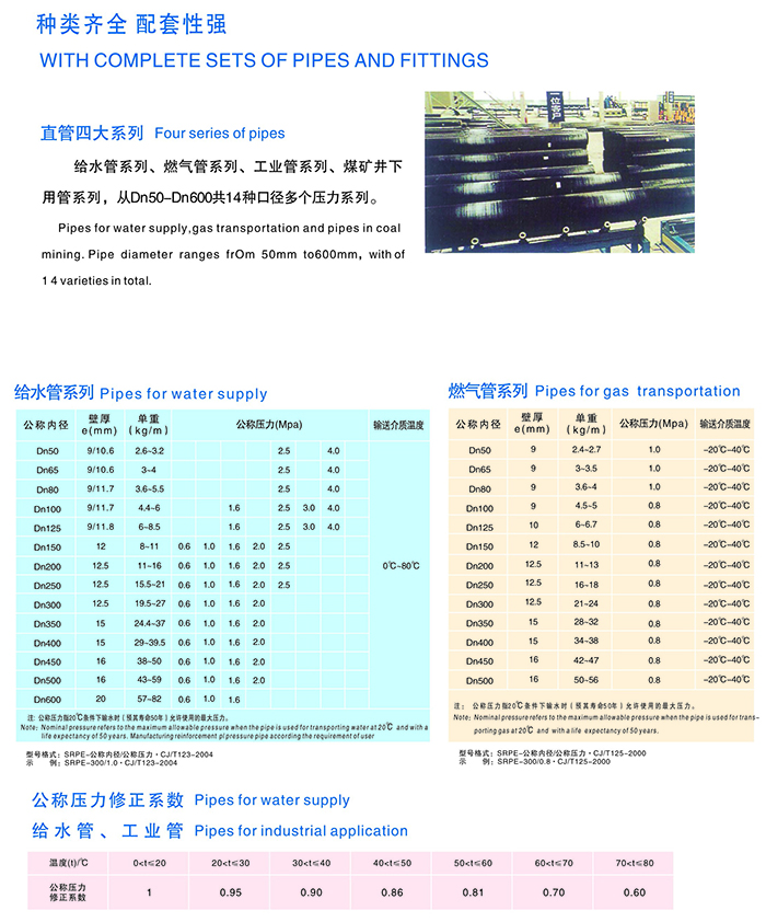 安源管道實(shí)業(yè)股份有限公司始建于2002年,是江西省唯一一家鋼骨架聚乙烯塑料復(fù)合管道生產(chǎn)企業(yè)。公司坐落于江西省萍鄉(xiāng)市高新技術(shù)工業(yè)園玉湖路1號(hào),占地12萬平方米,緊鄰滬瑞高速公路,浙贛鐵路線和319、320國(guó)道,距長(zhǎng)沙黃花機(jī)場(chǎng)僅70分鐘車程。公司注冊(cè)資本7650萬元,現(xiàn)有員工305人,其中大專以上學(xué)歷人員84人,擁有高級(jí)職稱人員12人,專職研發(fā)人員32人,是集產(chǎn)品專業(yè)化研發(fā)、生產(chǎn)、營(yíng)銷、技術(shù)服務(wù)、人才培訓(xùn)為一體的現(xiàn)代化管道企業(yè),自2013年起連續(xù)被評(píng)為高新技術(shù)企業(yè),并于2016年12月在“新三板”成功掛牌,證券代碼:870160。 安源管道公司擁有當(dāng)今國(guó)內(nèi)技術(shù)領(lǐng)先的12條生產(chǎn)線及配套的管件生產(chǎn)設(shè)備,年生產(chǎn)各種管徑的鋼骨架塑料復(fù)合管和鋼絲網(wǎng)骨架塑料復(fù)合管產(chǎn)達(dá)1000公里。產(chǎn)品遠(yuǎn)銷國(guó)內(nèi)30多個(gè)省、市,并出口國(guó)外,用戶達(dá)2000余家,廣泛應(yīng)用于石油、化工、燃?xì)狻⒐┧、采礦等行業(yè),是目前國(guó)內(nèi)唯一能生產(chǎn)Dn600鋼骨架聚乙烯塑料復(fù)合管的企業(yè)。 安源管道公司創(chuàng)建10余年來,牢固樹立科技興企、質(zhì)量興企的發(fā)展意識(shí),大力實(shí)施品牌化生產(chǎn)、差異化發(fā)展戰(zhàn)略,全面提升產(chǎn)品研發(fā)與市場(chǎng)競(jìng)爭(zhēng)力,先后有66個(gè)項(xiàng)目取得國(guó)家專利(其中3項(xiàng)發(fā)明專利),形成了具有高市場(chǎng)占有率的品牌優(yōu)勢(shì)。公司經(jīng)濟(jì)效益連續(xù)多年穩(wěn)步增長(zhǎng),先后被評(píng)為江西省國(guó)資委先進(jìn)基層黨組織、江西省質(zhì)量管理先進(jìn)企業(yè)、江西省名牌產(chǎn)品、江西省高新技術(shù)企業(yè)、萍鄉(xiāng)市市長(zhǎng)質(zhì)量獎(jiǎng)、江西省模范職工之家、江西省五一勞動(dòng)獎(jiǎng)狀、江西省職業(yè)道德標(biāo)兵單位、萍鄉(xiāng)十大品牌企業(yè)、萍鄉(xiāng)市開發(fā)區(qū)“五星”信用示范企業(yè)、萍鄉(xiāng)市開發(fā)區(qū)知識(shí)產(chǎn)權(quán)示范企業(yè)等。公司“企業(yè)技術(shù)中心”經(jīng)省工信委認(rèn)定為“省級(jí)企業(yè)技術(shù)中心”。 安源管道公司以“質(zhì)量為本,服務(wù)客戶,用戶至上”的發(fā)展理念,竭誠(chéng)為廣大用戶服務(wù);同時(shí)以精良的現(xiàn)代工藝、嚴(yán)密的質(zhì)量控制、完善的服務(wù)體系、誠(chéng)實(shí)守信的經(jīng)營(yíng)理念,致力于不斷發(fā)展管道制造業(yè)。 產(chǎn)品介紹: