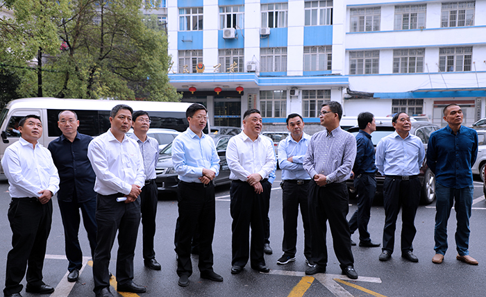 圖為周敏一行現(xiàn)場觀摩萍礦機械廠研發(fā)制造的垂直循環(huán)類立體車庫運行情況。