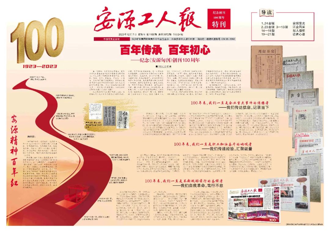 值此創(chuàng)刊百年之際,《安源工人報(bào)》推出“安源精神百年紅”紀(jì)念《安源旬刊》創(chuàng)刊100周年特刊,分“安報(bào)榮光”“江企風(fēng)采”“報(bào)人情懷”“讀者心語(yǔ)”四個(gè)部分24個(gè)版面,以記者、讀者、通訊員、老報(bào)人之筆觸、鏡頭,深情緬懷毛澤東、劉少奇、李立三等老一輩無(wú)產(chǎn)階級(jí)革命家在安源開(kāi)展工人運(yùn)動(dòng)的豐功偉績(jī),回顧《安源旬刊》的厚重歷史和跨越百年的文化傳播魅力,大力弘揚(yáng)偉大的百年安源精神,展現(xiàn)江投集團(tuán)各企業(yè)蓬勃發(fā)展的良好態(tài)勢(shì)。