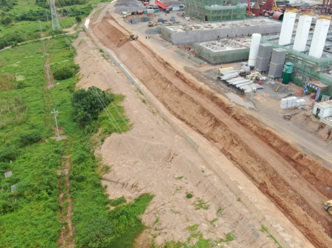 均化庫(kù):基礎(chǔ)工程完成98%,擋土墻墻身完成95%,鋼結(jié)構(gòu)安裝完成75%。