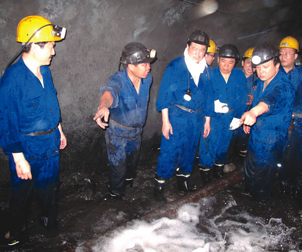 集團(tuán)公司總經(jīng)理魏建明(左三)7月1日上午在304盤區(qū)察看災(zāi)情。(記者 袁鵬 攝)