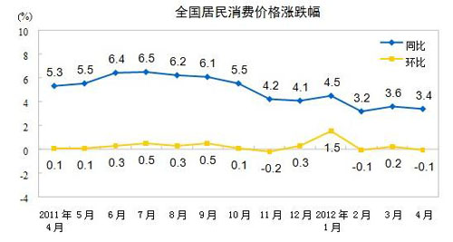 國家統(tǒng)計局今日(11日)公布的數(shù)據(jù)顯示,2012年4月份,全國居民消費價格總水平同比上漲3.4%。